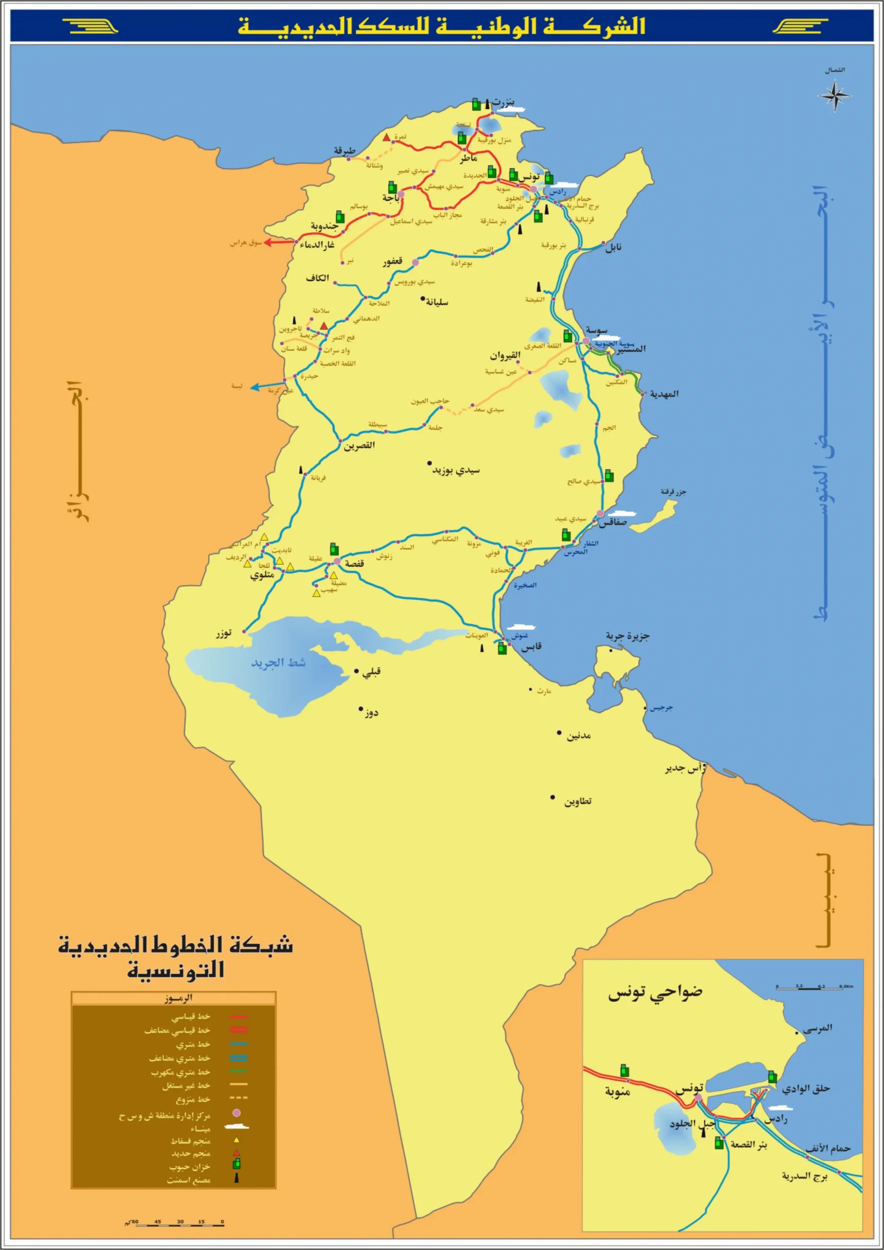 تضم الشبكة الحديدية التونسية 23 خطا ويبلغ طولها الاجمالي 2170 كلم: